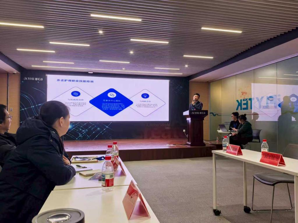 活动第一阶段,与会人员集体参观科大讯飞天津公司 AI 人工智能展览体验厅;随后科大讯飞分享数字化赋能技术与案例,中民聚康企业代表介绍了“家政+养老” 融合发展的实践经验。我校教师代表重点介绍学校承接家政、餐饮职业技能培训与认定的优势资源、课程体系及成果,展现了我校服务地方产业发展的责任与担当,获得与会各方广泛关注。互动讨论环节,我校教师与参会代表围绕技能培训标准化、数字化教学资源开发等议题深入交流。